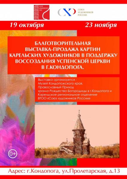 23 октября Музей Кондопожского края при содействии Карельского отделения Союза художников России открыл благотворительную выставку-продажу картин карельских художников в поддержку воссоздания Успенской церкви в г.Кондопога.Все собранные средства пойдут на восстановление Успенской церкви в Кондопоге.